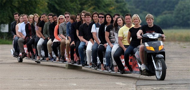 Weltrekord Colin Furze mit 22m ScooterColin Furze baute mit einer Länge von 22 Metern und 25 Sitzen den längsten fahrbaren Scooter der Welt.