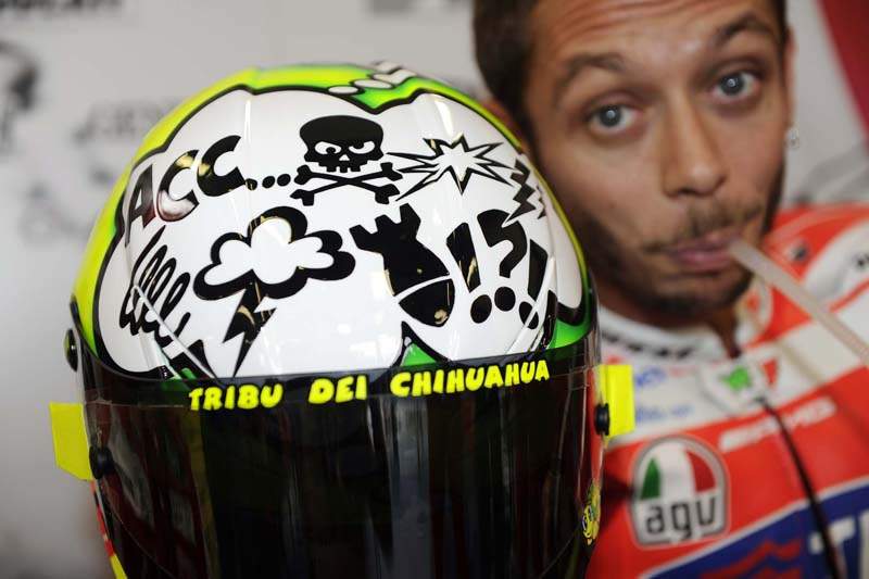 Beim Heimrennen in Misano trägt Valentino Rossi jedes Jahr einen Helm mit speziellem Dekor. In diesem Jahr ist er besonders Aussagekräftig.