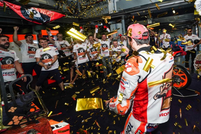Foto von Marc Marquez vom Rennen 2019 in Thailand wo er frühzeitig MotoGP Weltmeister 2019 wurde.