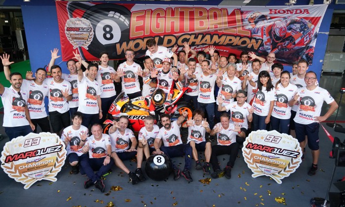 Foto von Marc Marquez vom Rennen 2019 in Thailand wo er frühzeitig MotoGP Weltmeister 2019 wurde.