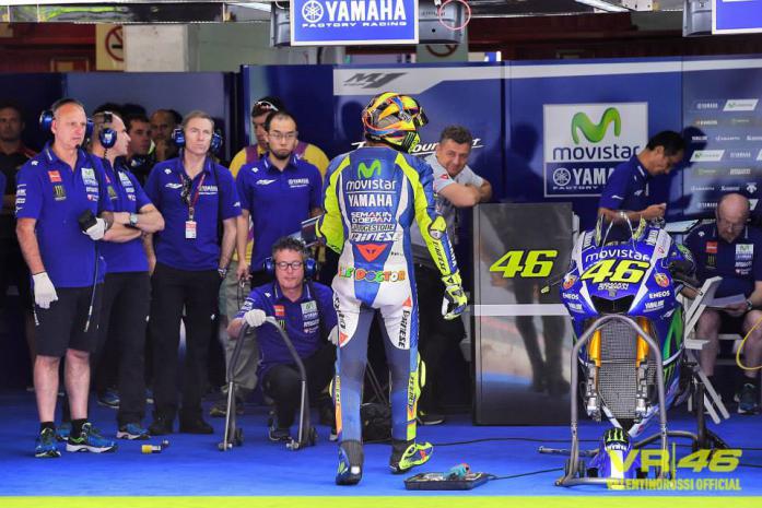 Valentino Rossi betrachtet den Zeitenmonitor in seiner Yamaha Box beim MotoGP Rennen in Barcelona